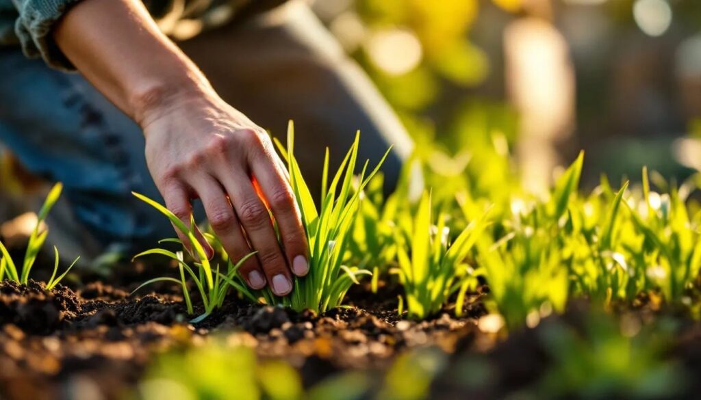 Den Rasen in den ersten zwei Wochen nach dem Vertikutieren nicht kürzer als 5 Zentimeter schneiden, damit sich die Gräser ungestört erholen und die Nachsaat aufgehen kann. Unkrautpflanzen, die nach der Bodenöffnung keimen, mit einem Handstecher einzeln herausstechen — ein Breitbandherbizid würde gleichzeitig die frisch gekeimten Grassamen schädigen.